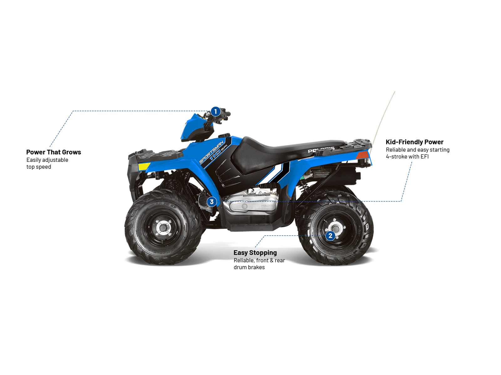 A 110cc EFI engine and kid-friendly accessories allow younger riders to grow with their ATV. Made for riders ages 10+.